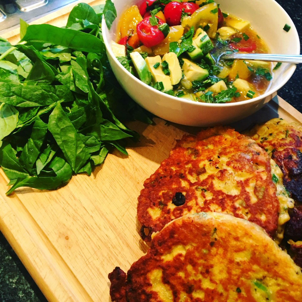 Salmon and Potato Cakes with Tomato and Avocado Salad