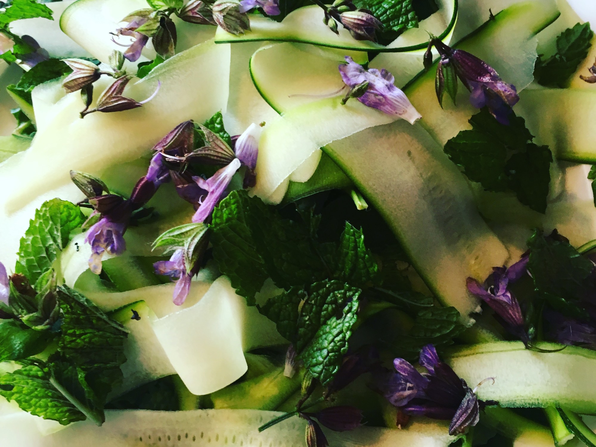 My sage in the garden is flowering and I have an abundance of mint and spinach….. which all lend themselves to a salad. Add ribbons of courgette and you are on to a winner. And it looks pretty. If you don’t have edible flowers on hand, use some sliced pear or orange segments. Slivers of parmesan will work well here too. Courgette doesn’t need to be cooked, I like it raw personally. But grilled or BBQ’d will be just as tasty.