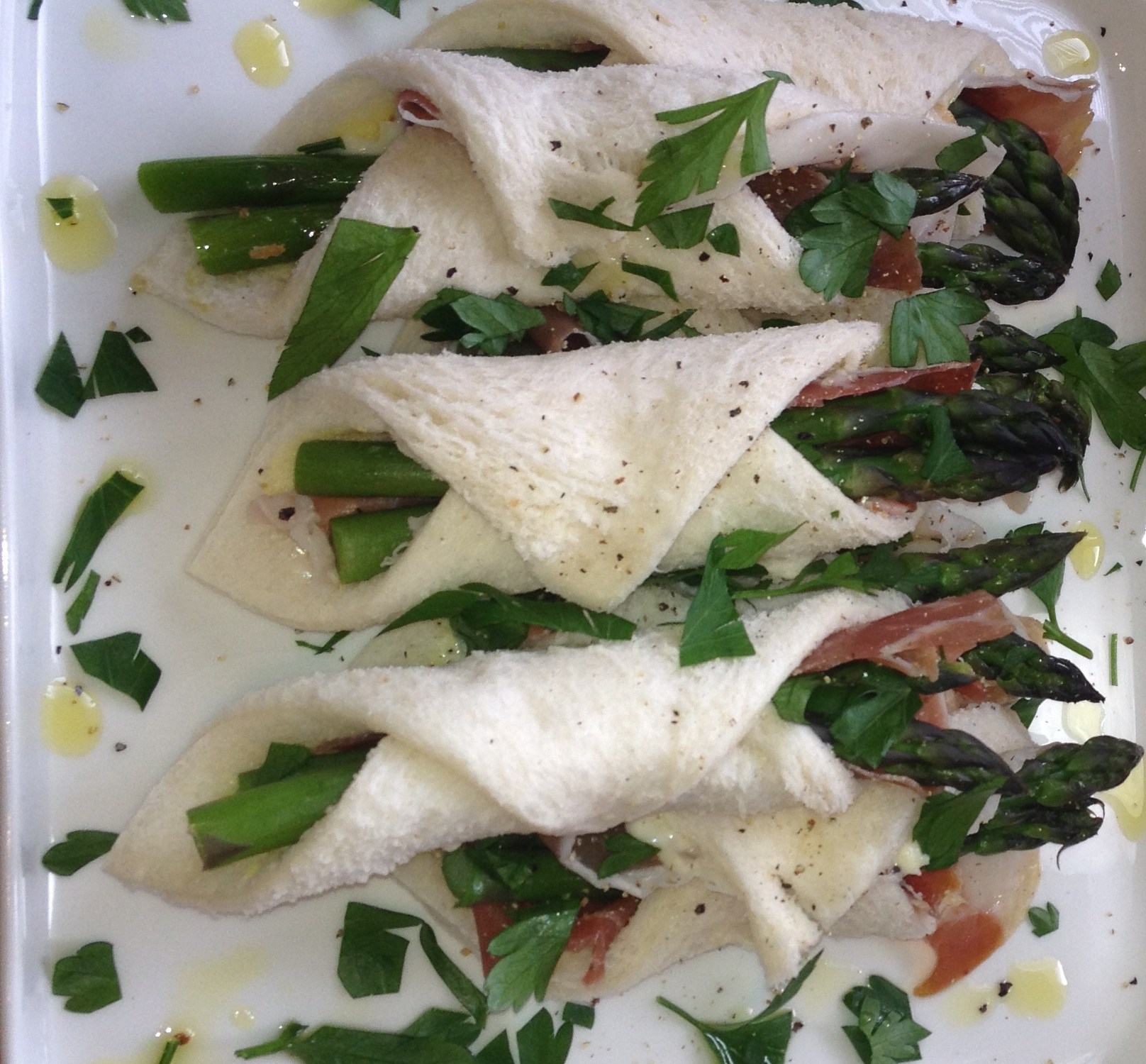 Layer the prosciutto over the bread and place your asparagus on top.