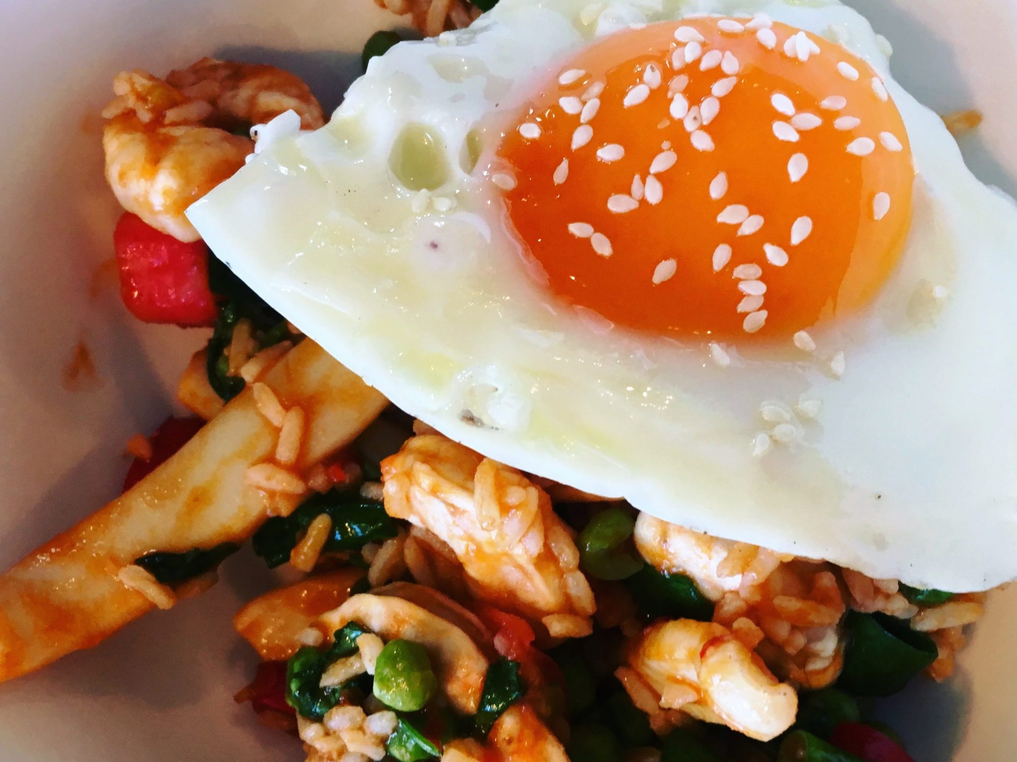 This is a delicious Indonesian dish Nasi Goreng and super easy and gluten free. You can pretty much do anything with it, but the essentials are rice, chicken, prawns and a nice fried egg. Along with the Nasi Goreng paste that is!