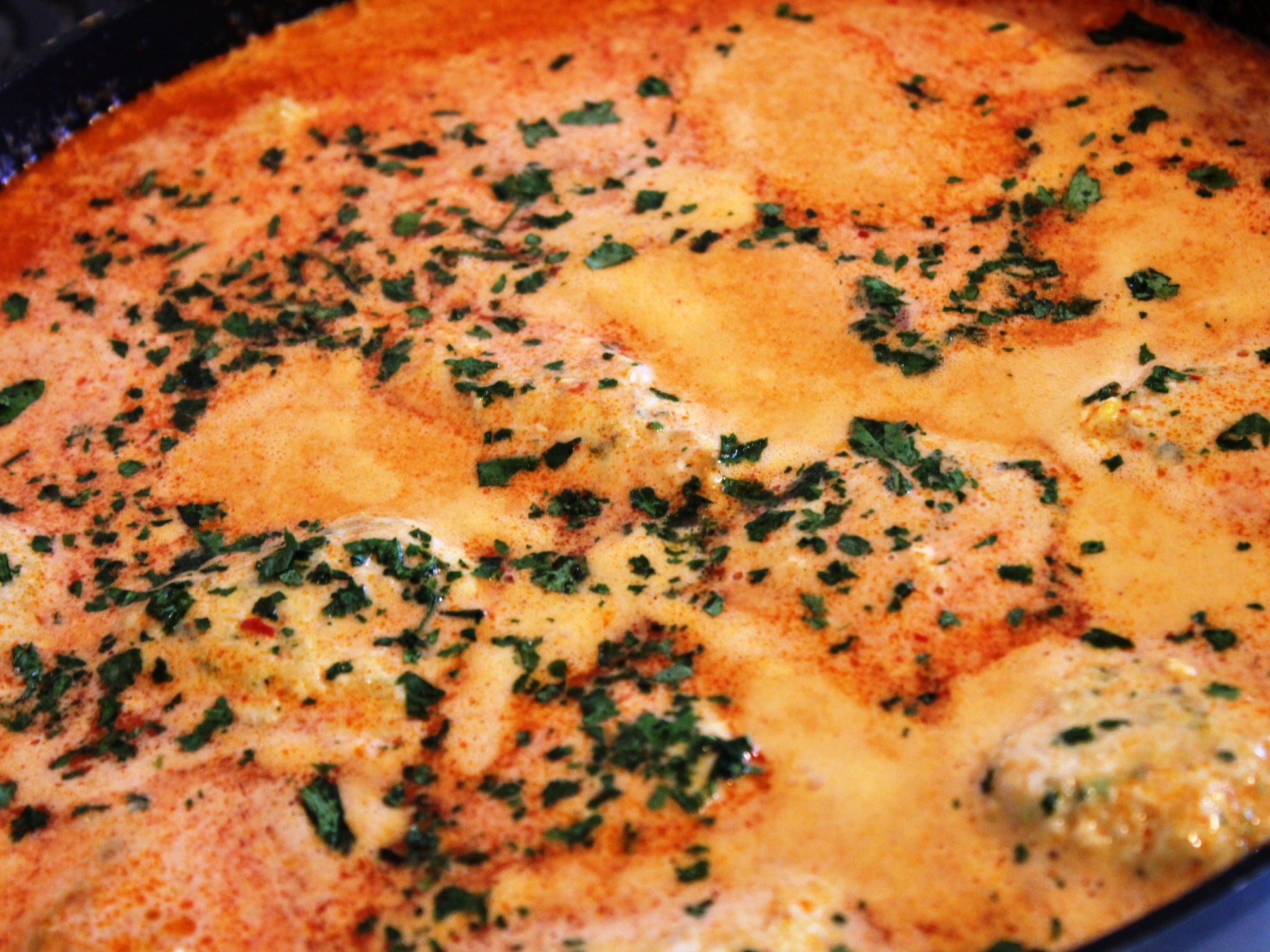 Using the same pan, pop in some red curry paste. I used around 1/2 a jar of store bought red curry paste. Fry off till you can smell the fragrance. Tip in a can of coconut cream and 2 ladles of chicken stock. Stir and bring to the heat. Taste. I added extra chilli at this point. It is really to taste.