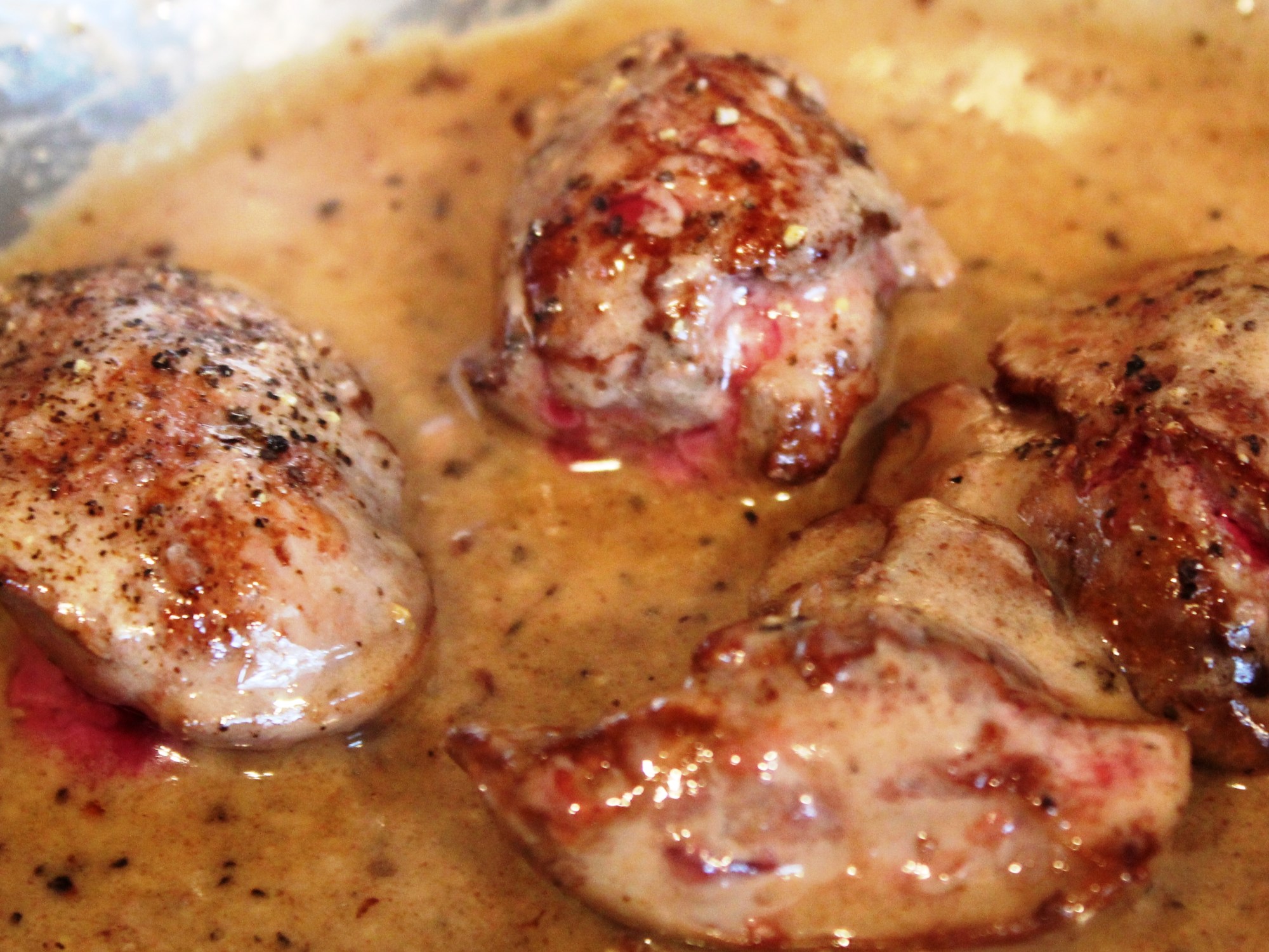 Heat oil or butter in a wee pan till hot, drop in the livers – be VERY careful they spit. Turn and tip in a dash of marsala. Allow the alcohol to burn off (doesn’t take long). Stir in the cream for cooking and salt and pepper.