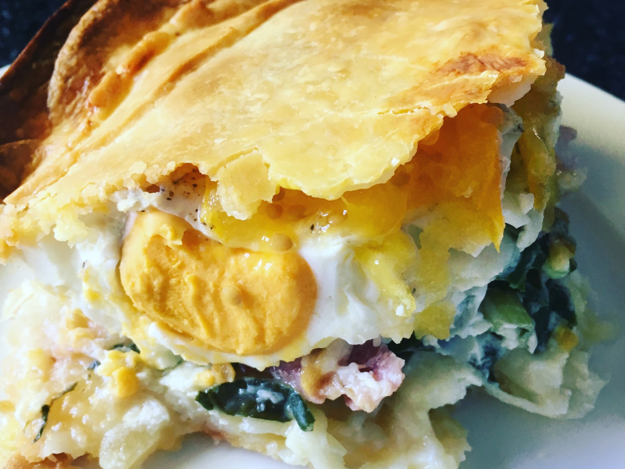 Cover the filling with your top layer of pastry and brush with a beaten egg. This will give it a lovely colour. Poke a few holes so the steam can escape and bake for around 45 mins. EAT IT!