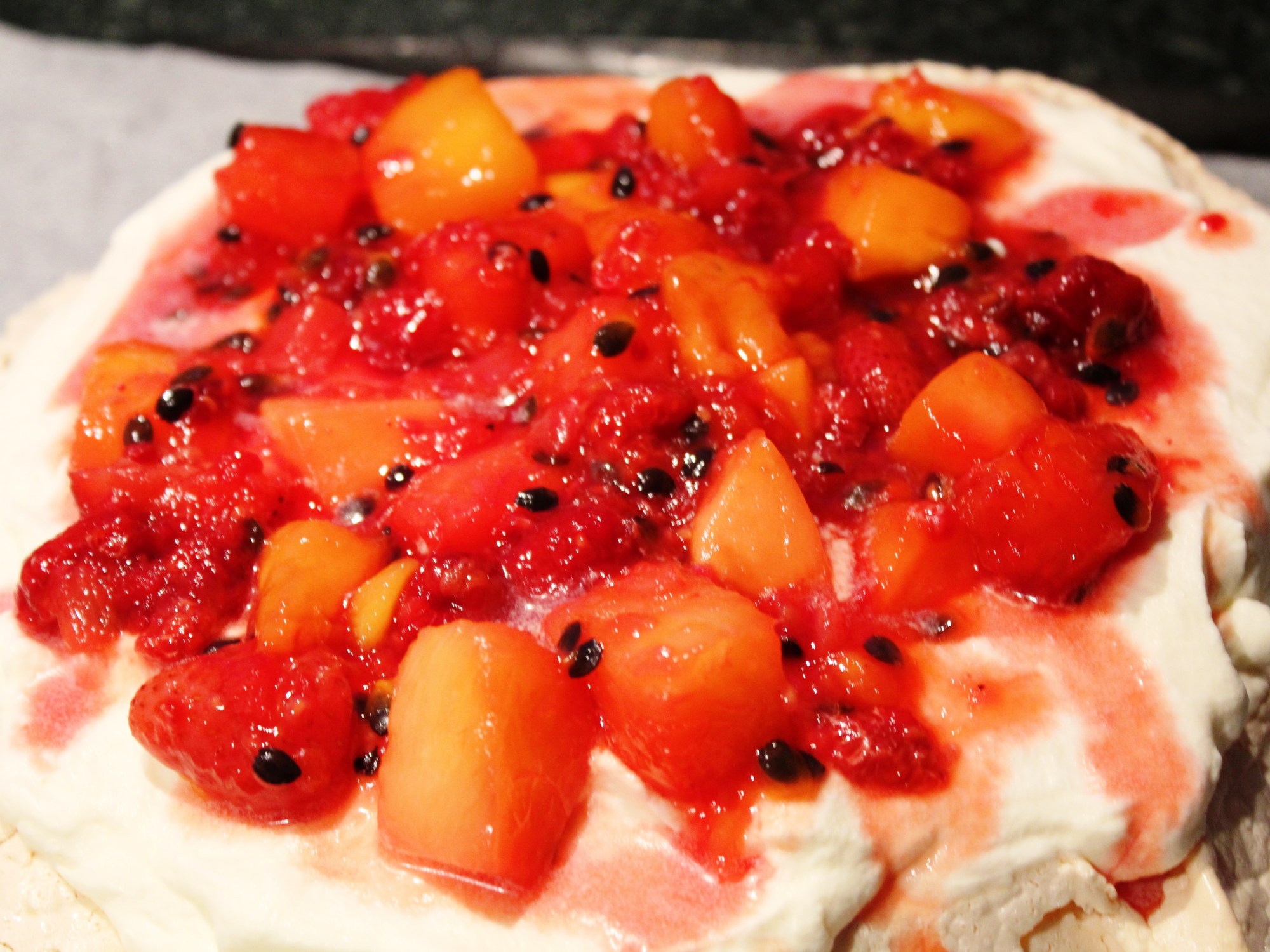 Whip some cold cream with icing sugar, and lather on top. Scatter with any fruit you have on hand or fancy. You will have crispy outside with a pillowy/marshmallow center. Even husband who stated he didn’t like pav or marshmallow ate it! And nodded. Oddly, mine was better the next day after being in the fridge over night. No idea why!